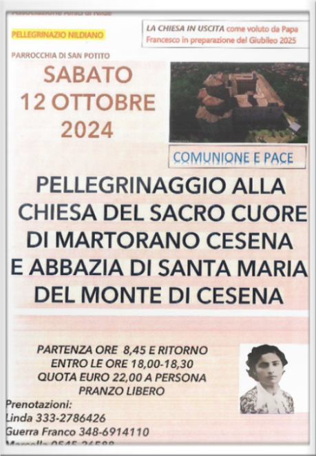 Con tre pulmini siamo partiti in 22 da San Potito diretti verso Martorano e l' abbazia di Santa Maria del Monte di Cesena, due luoghi scelti per la devozione di Nilde al Sacro Cuore. Al santuario del Sacro Cuore di Gesù di Martorano bellezza artistica e fede si coniano magnificamente: la struttura esterna da l' idea della grande tenda di Dio piantata tra le case degli uomini.