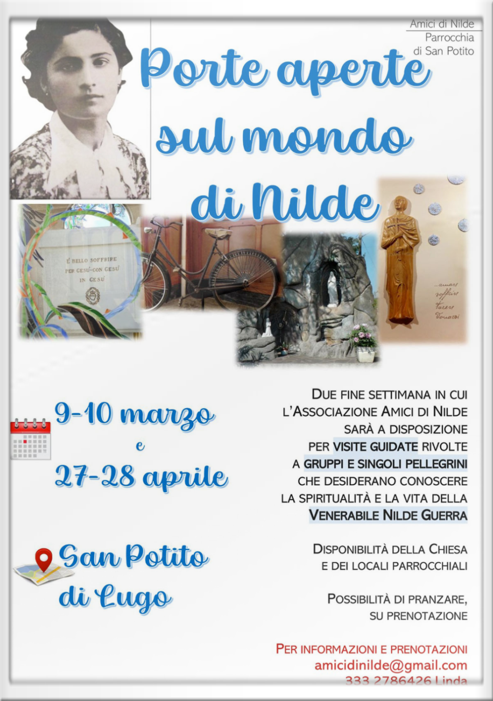 Nilde Guerra, una vita da fare conoscere! È questo il compito dell’associazione che porta i1 suo nome: «Fare conoscere, amare e pregare Nilde pechè la sua vita ha molto da dire ancora oggi ed e una storia bella che arricchisce chi si avvicina a lei». Per questo i volontari dell' associazione, che è guidata dal presidente Franco Guerra hanno organizzato due weekend dedicati alla Venerabile Nilde Guerra e ai luoghi nei quali ha vissuto a San Potito di Lugo. I volontari sono a disposizione per accompagnate gruppi e singoli fedeli alla scoperta dei luoghi di Nilde e della sua storia. Il primo appuntamento è nelle giornate del 9 e 10 marzo, il secondo il 27 e 28 aprile. La visita comprende la casa dove ha vissuto Nilde, dove si potrà visitare la sua camera da letto con l'altarino dove pregava con l' inginocchiatoio, si potranno vedete i suoi abiti e gli oggetti di vita quotidiana. La visita prosegue nell'ex asilo alla mostra che ripercorre la sua vita. Ci si sposterà poi alla tomba con tutti i riferimenti alla sua spiritualità, dal suo impegno di vita (amare, soffrire, tacere e donarsi) al mosaico raffigurante il Cristo Pantocratore. Durante il percorso è prevista anche la visita in chiesa, con i dipinti di Nilde, e alla casa natale, dove è stata affissa una ceramica in ricordo. La Parrocchia di San Potito mette inoltre a disposizione per i gruppi la chiesa per la celebrazione, una sala per incontri e il circolo parrocchiale per il pranzo su prenotazione. L’invito é rivolto in maniera paricolare alle parrocchie del comprensorio che desiderano organizzare una giornata di ritiro e pellegrinaggio per gruppi di adulti o ragazzi del catechismo o gruppi giovani per avvicinarli alla figura di una donna che ha donalo la sua vita a Gesù. II 10 marzo parteciperanno alla visita i gruppi Unitalsi di Imola, Faenza, Ravenna.
