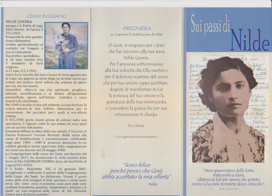 O Gesù, ti ringrazio per i doni che hai concesso alla tua serva Nilde Guerra. Per l' amorosa sottomissione alla tua volontà che Ella mostrò e per il doloroso martirio del cuore che per tuo amore seppe accettare, degnati di manifestare in Lei la potenza del tuo amore e la grandezza della tua misericordia e concedimi la grazia che per sua intercessione ti chiedo.